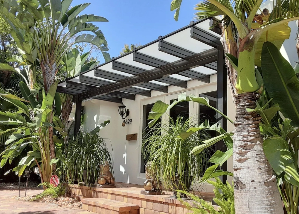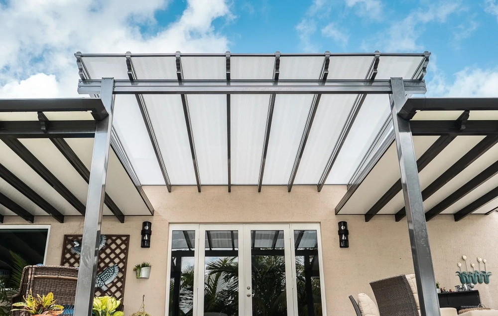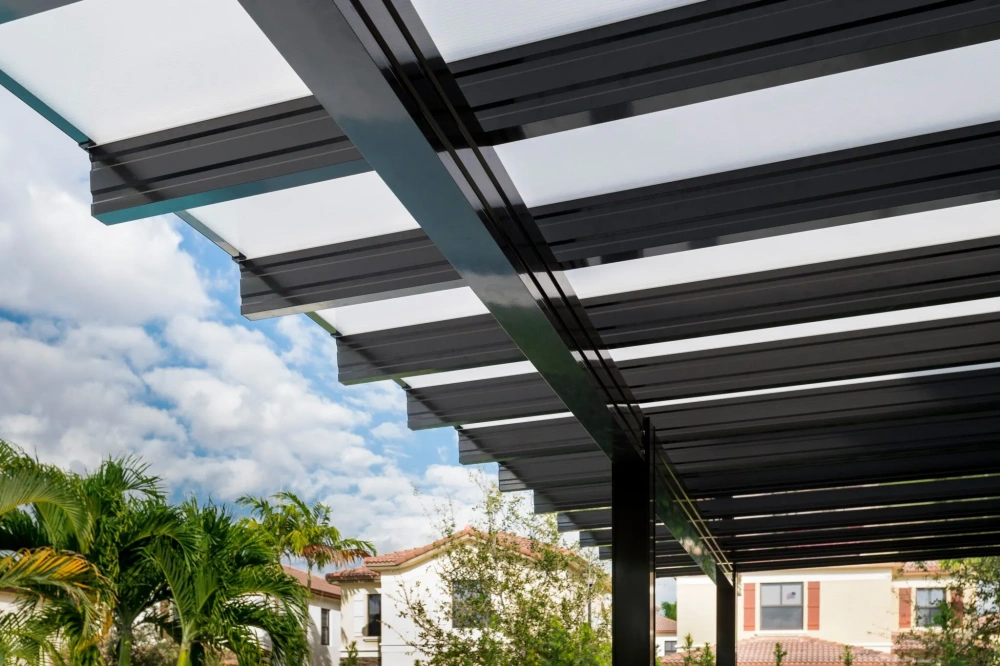Aircraft grade powder-coated extruded aluminum can stand the test of time while remaining beautiful and requiring little to no maintenance. High carbon steel and nylon headed fasteners withstand the worst nature can throw at them, and automotive grade nylon covers and caps create a smooth and complete appearance designed to live in the sun.Insulated polycarbonate roof panels