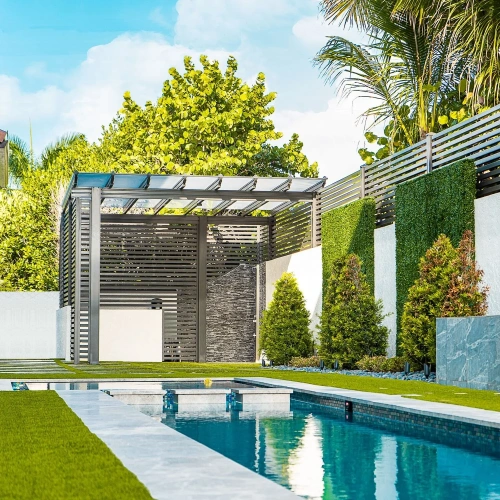 The Aria shade trellis was designed from the ground up to serve two purposes. First, to be a stunning work of art in your backyard, and second, to provide shade so you can enjoy the outdoors all season long. The Aria shade trellis, although it looks similar to a wooden shade trellis, incorporates nothing but the highest quality materials. Aircraft-grade extruded aluminum beams, baked-on finishes, nylon head fasteners, decorative post covers, and of course, the highest strength engineered connections to insure your new shade trellis can stand the test of time. Compare the Aria to any system on the market and we think you will agree, nothing beats the clean lines, and stunning look and feel, with high-strength, worry-free materials.